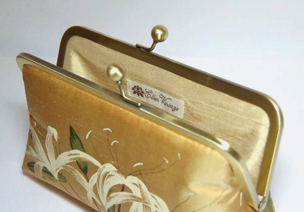 This beautiful clutch with light flowers printed on gold Italian silk taffeta. The flowers look hand printed, beautiful and delicate. Taffeta is lightweight silk with a subtle sheen and a distinctive rustle. One of the oldest luxury fabrics, popular for wedding gowns. Taffeta is machine made and there are no slubs.
