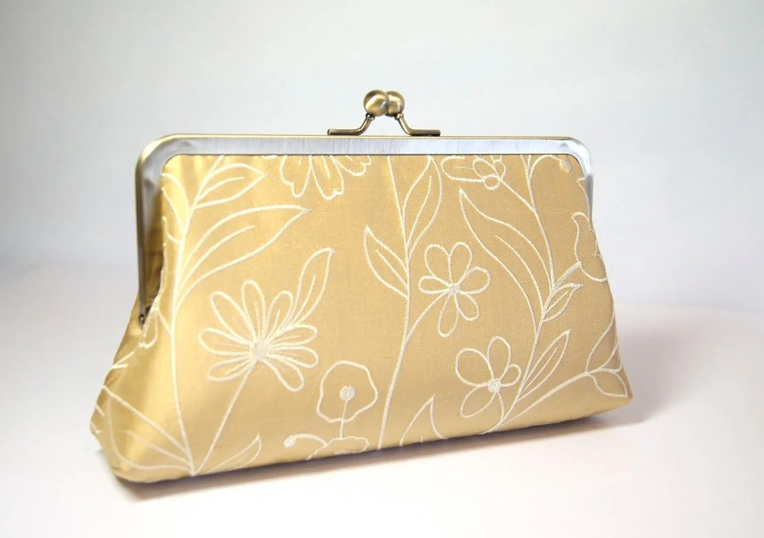 The clutch is made from an English designer’s beautiful embroidered gold dupioni silk fabric and it is in a limited amount.